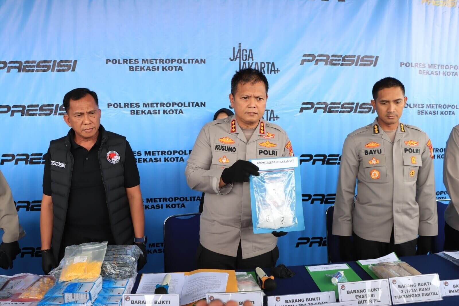 Konferensi pers yang berlangsung di halaman Mapolres Metro Bekasi Kota ini dipimpin langsung oleh Kapolres Kombes Pol Kusumo Wahyu Bintoro, S.H., S.I.K., M.H., didampingi Wakapolres Kombes Pol Bayu Pratama Gubunagi, Kasatesnarkoba Kompol Untung Riswaji, Kasie Humas AKP Suparyono, dan Kanit Propam AKP Ubaidillah.