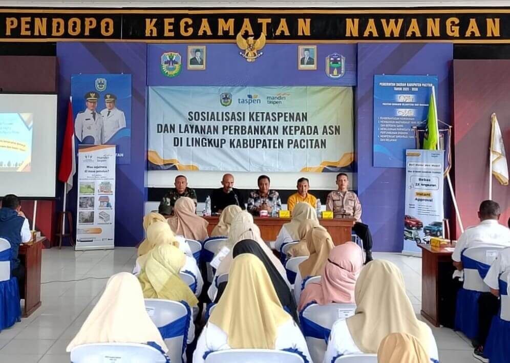 mediapatriot.co.id. Pacitan – PT Bank Mandiri Taspen menggelar sosialisasi Ketaspen (Kartu Peserta Taspen) sekaligus layanan perbankan khusus bagi Aparatur Sipil Negara (ASN) dan pensiunan di wilayah Kecamatan Nawangan. Kegiatan ini berlangsung di Balai Pendopo Kecamatan Nawangan, Kabupaten Pacitan, Rabu (28/1/2026), sebagai upaya mendorong kesiapan finansial ASN menjelang masa purna tugas.