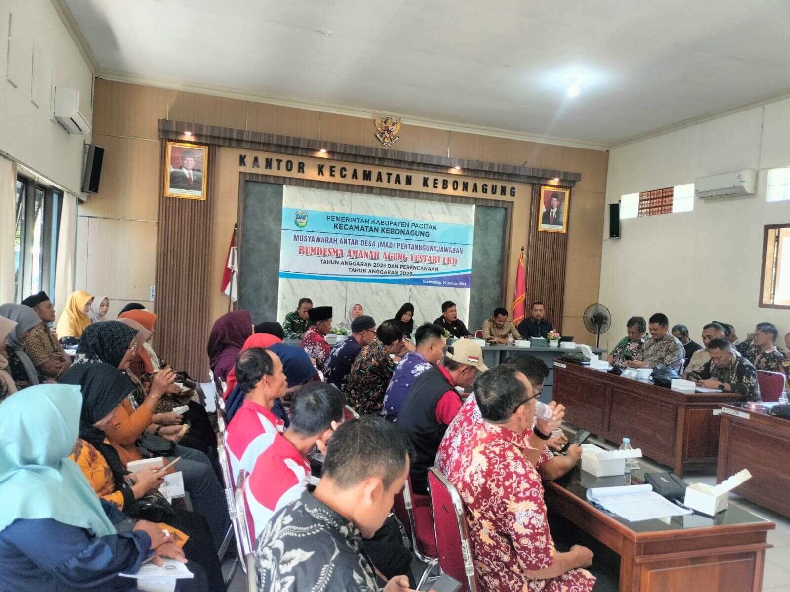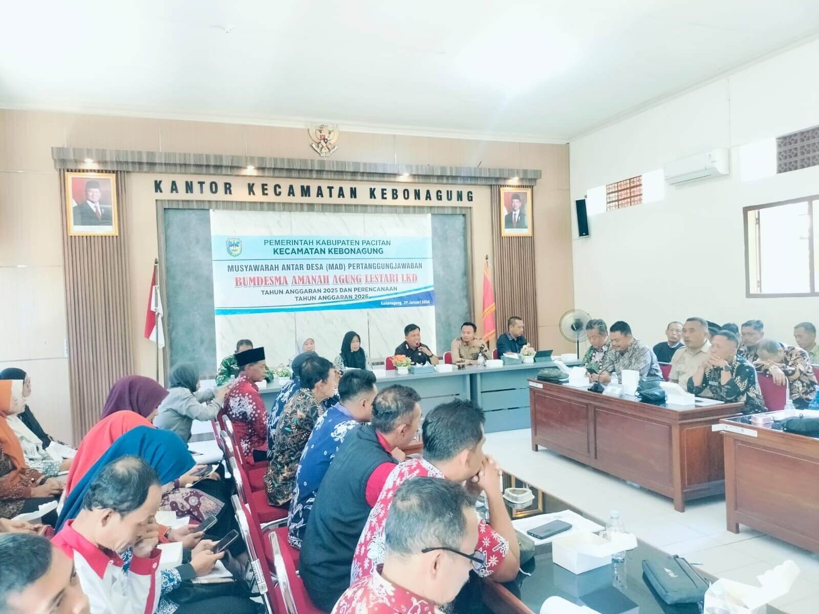 mediapatriot.co.id. Pacitan – Danramil 02/Kebonagung Kodim 0801/Pacitan, Lettu Cpl Indra Masruhin, menghadiri Rapat Koordinasi Musyawarah Antar Desa (MAD) dalam rangka penyampaian laporan pertanggungjawaban Tahun Anggaran 2025 Badan Usaha Milik Desa Bersama (Bumdesma) Amanah Agung Lestari LKD sekaligus perencanaan anggaran Tahun 2026. Kegiatan tersebut berlangsung di ruang pertemuan Kecamatan Kebonagung, Kabupaten Pacitan, Kamis (29/1/2026).