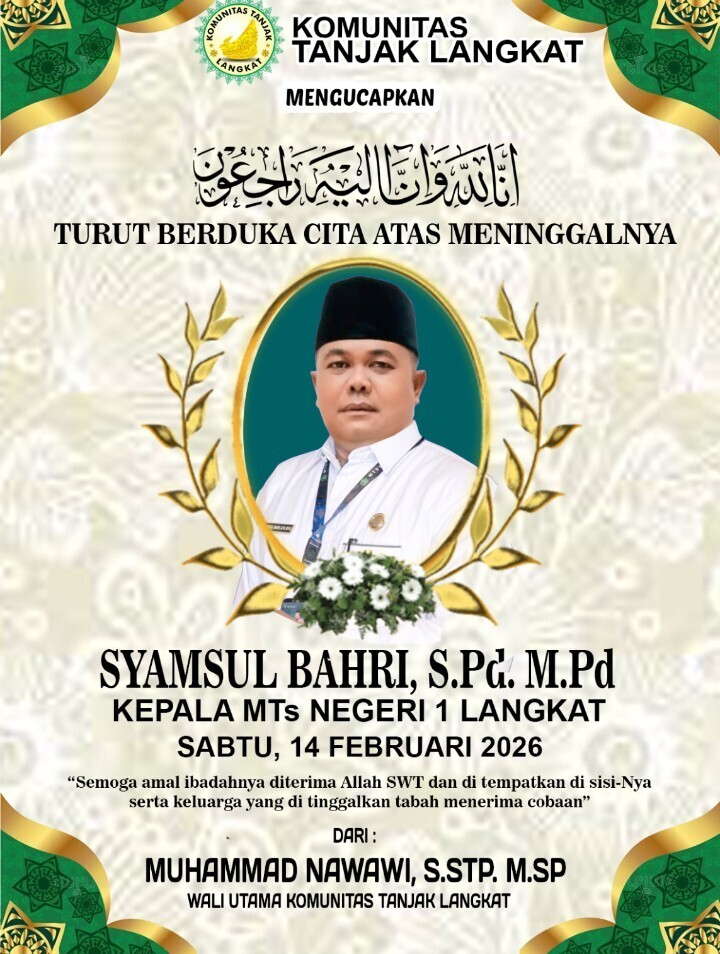 Mediapatriot.co.id | Langkat | Sumatera Utara | Berita Terkini – Langit pendidikan di Kabupaten Langkat seakan meredup pada Sabtu, 14 Februari 2026. Kabar wafatnya Syamsul Bahri, S.Pd., M.Pd., Kepala MTs Negeri 1 Langkat, menyisakan duka mendalam bagi keluarga besar dunia pendidikan, para guru, siswa, serta masyarakat yang mengenalnya sebagai sosok pemimpin yang bersahaja namun visioner.