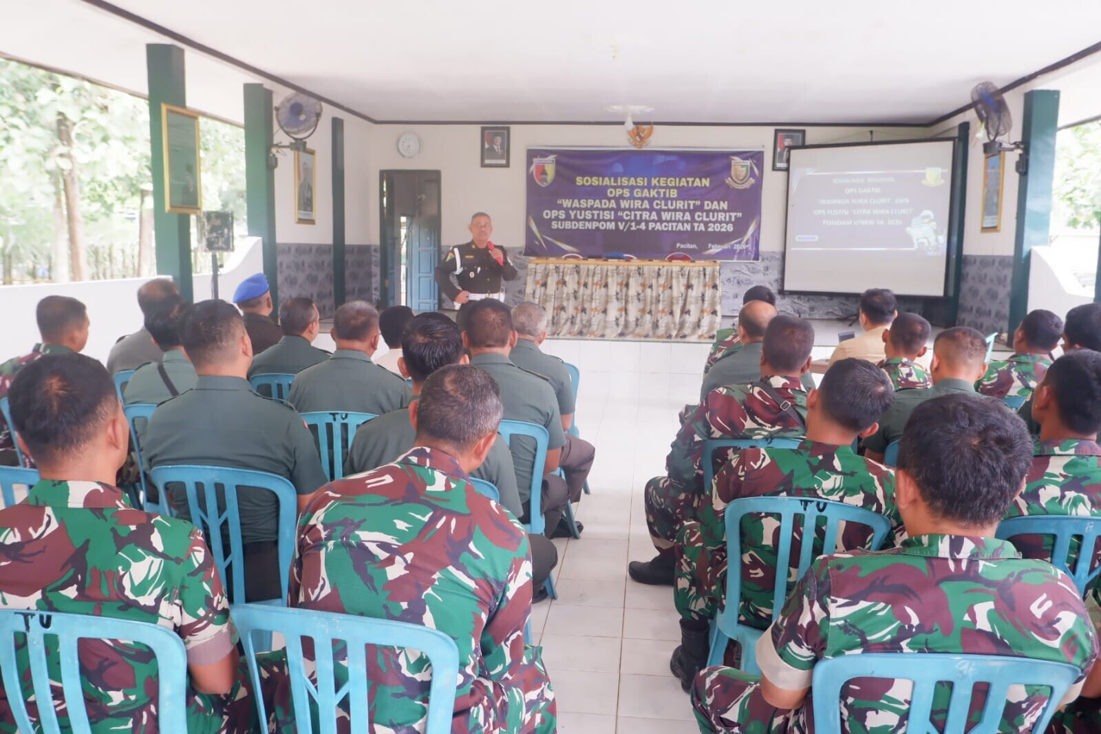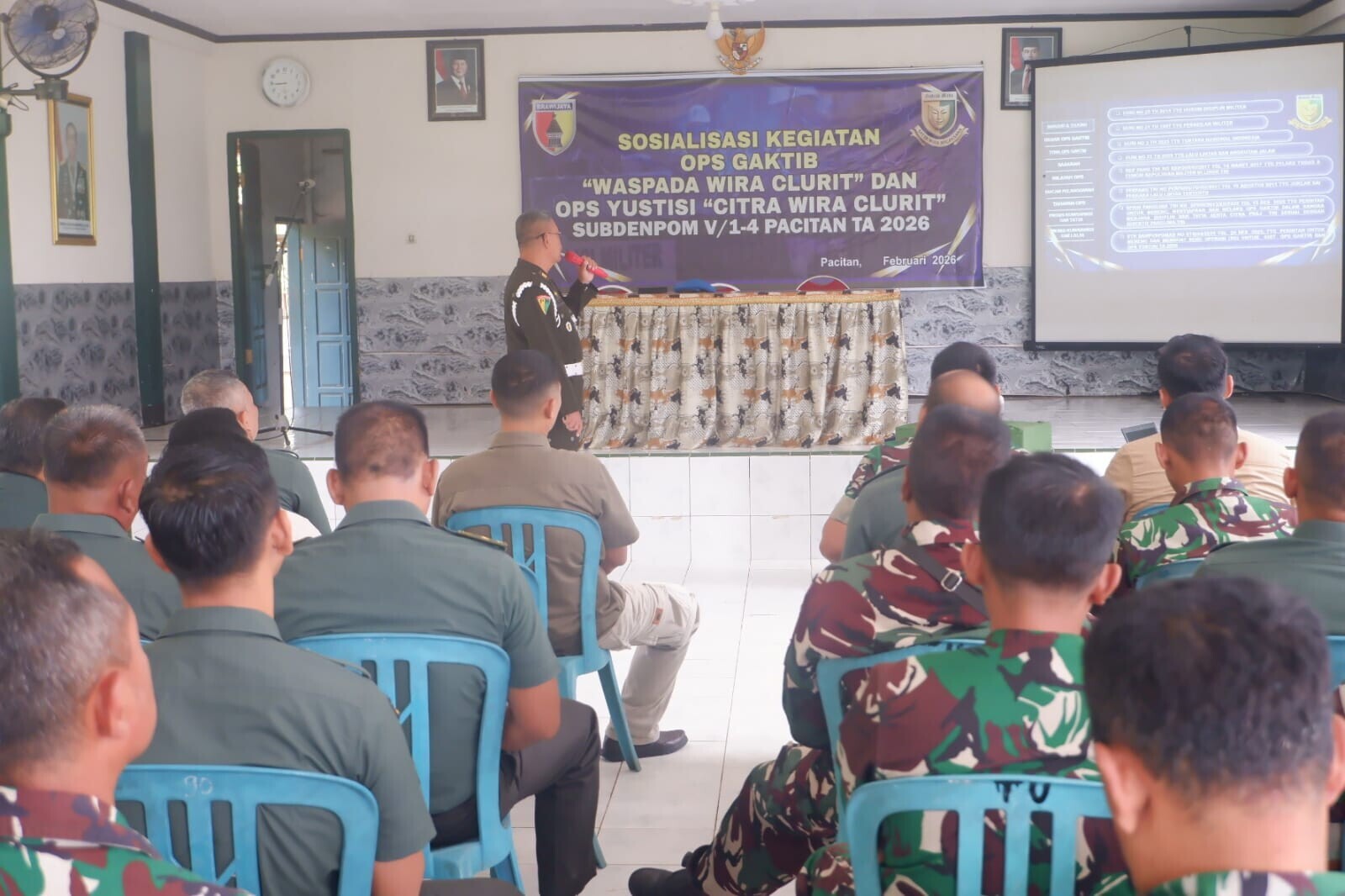 mefiapatriot.co.id Pacitan, – Dalam upaya meningkatkan disiplin dan kepatuhan hukum prajurit, Kodim 0801/Pacitan bersama Subdenpom V/1-4 Pacitan menyelenggarakan sosialisasi kegiatan Operasi Penegakan Ketertiban (Ops Gaktib) bertajuk “Waspada Wira Clurit” serta Operasi Yustisi. Kegiatan tersebut digelar di aula Kopral Sigit Makodim 0801/Pacitan dan diikuti oleh seluruh anggota militer maupun PNS di lingkungan Kodim serta anggota Subdenpom V/1-4 Pacitan, Kamis (19/2/2026).