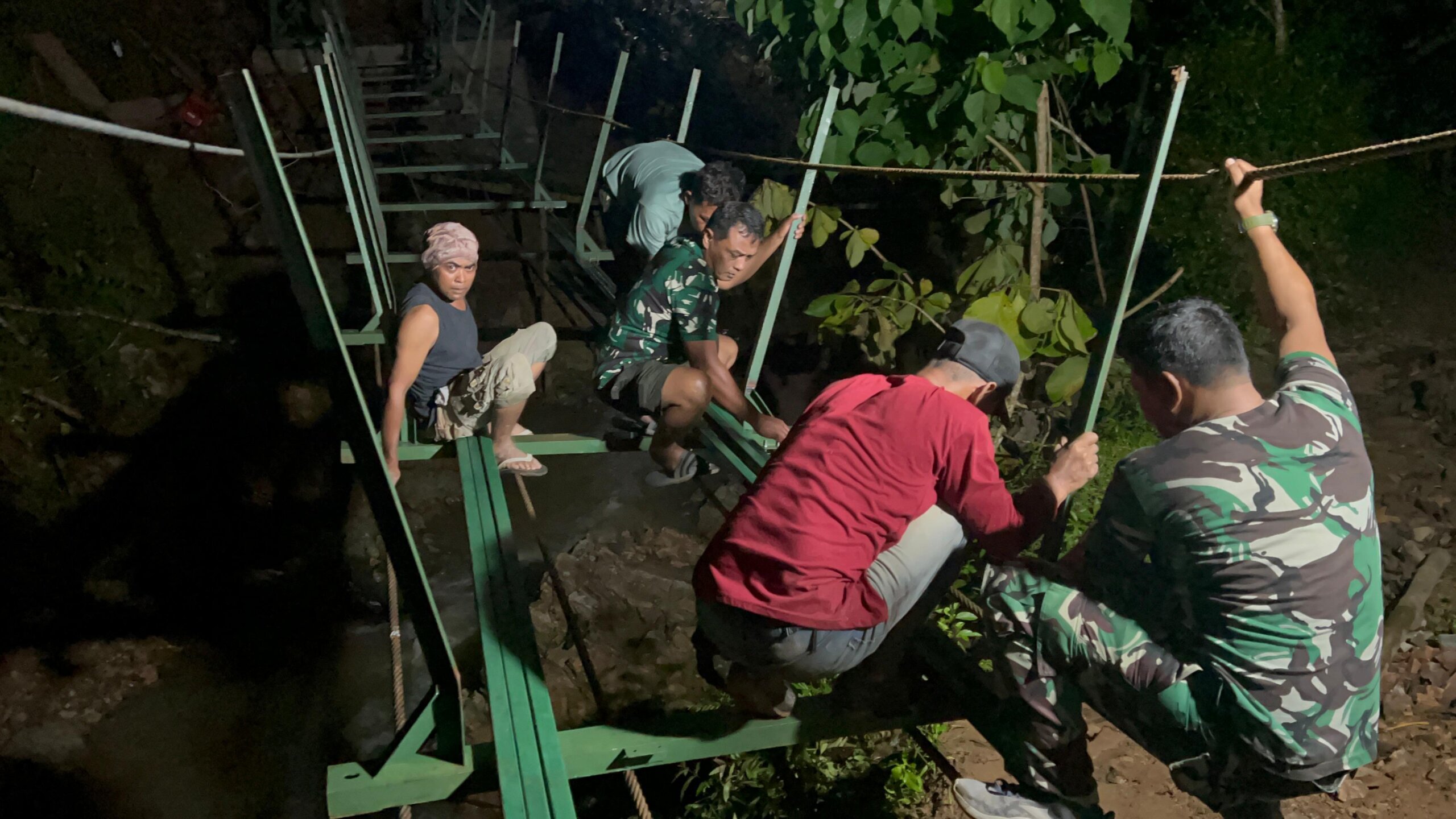mediapatriot.co.id Pacitan – Di tengah keheningan malam tampak terlihat sebuah pemandangan luar biasa tersaji. Prajurit TNI bersama warga tepatnya di Dusun Karang, Desa Pagutan, Kecamatan Arjosari, Kabupaten Pacitan, pada Rabu(25/2/2026) malam, yang tak kenal lelah berjuang di bawah cahaya lampu senter dan Lampu sorot menjadi saksi bisu semangat gotong royong yang membara demi membangun jembatan gantung perintis garuda II yang menghubungkan antar kedua desa.