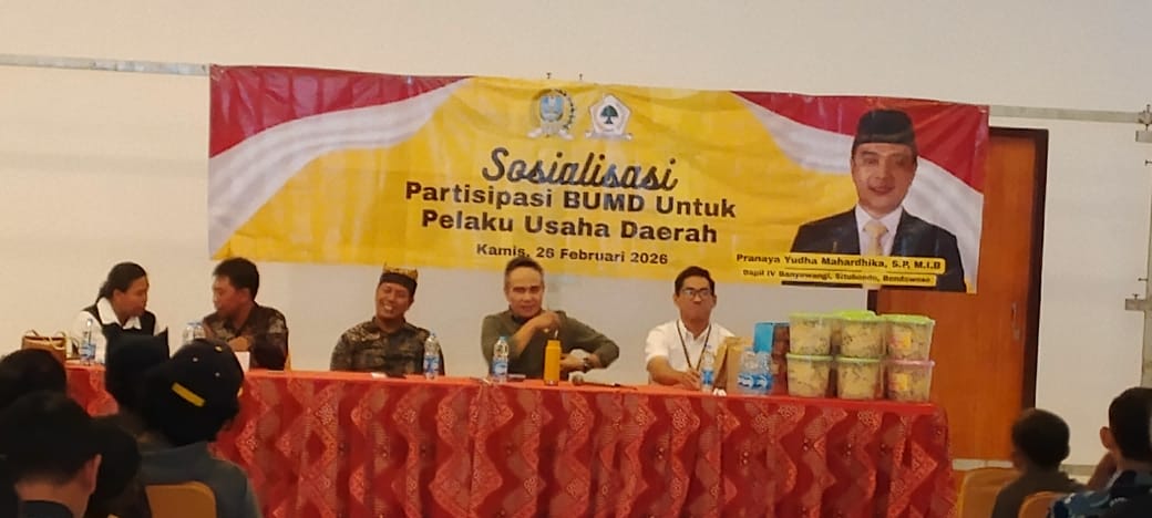 Rabu 25/02/2026, Fraksi Golkar Komisi C DPRD kabupaten Propinsi Jawa Timur, Dapil IV Banyuwangi, Situbondo dan Bondowoso,” Bpk.Pranaya Yudha Mahardhika,S.P.,M.I.B memberikan sosialisasi dalam partisipasi Bank Umum Milik Daerah, terhadap pelaku usaha mikro kecil dan menengah (UMKM )