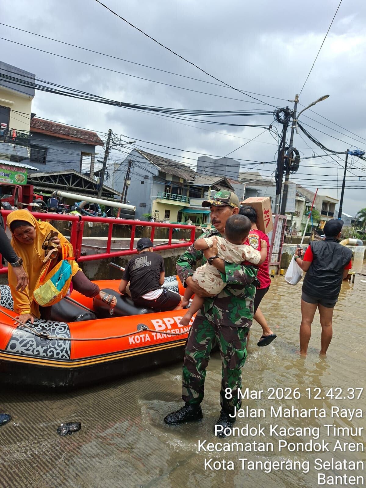 Kodam Jaya, Tangerang – Di tengah genangan air yang merendam permukiman warga Pondok Kacang Timur, Kecamatan Pondok Aren, Minggu pagi (8/3/2026), sebuah pemandangan sederhana namun menyentuh hati terjadi.