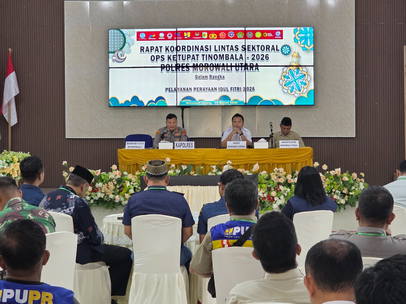 Morowali Utara, mediapatriot.co.id – Kepolisian Resor Morowali Utara menggelar rapat koordinasi (rakor) lintas sektoral dalam rangka menghadapi Operasi Ketupat Tinombala-2026. Sebanyak 221 personel gabungqn diturunkan untuk mengawal masyarakat yang akan melaksanakan mudik Lebaran 2026 di wilayah Kabupaten Morowali Utara. Rabu (11/3/2026)