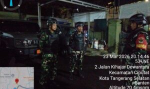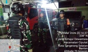 Kodam Jaya, Tangerang – Dalam rangka mengantisipasi potensi tindak kejahatan pasca Hari Raya Idul Fitri, personel Babinsa Koramil 01/Tgr dan Babinsa Koramil 05/Ciputat, Kodim 0506/Tgr melaksanakan patroli malam bersama unsur Linmas dan Mitra Jaya di wilayah teritorial Kodim 0506/Tgr, Senin malam (23/03/2026).