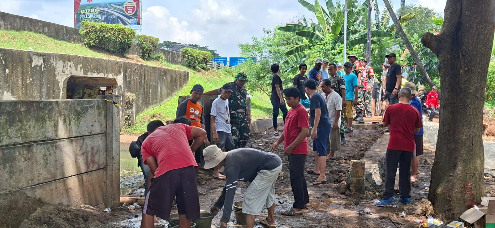 Hal itu dijalankan upaya rangka mendukung pembangunan jembatan beton garuda. Anggota Koramil 01/Tgr, Kodim 0506/Tgr bersama masyarakat melaksanakan gotong royong dilokasi pembangunan jembatan.