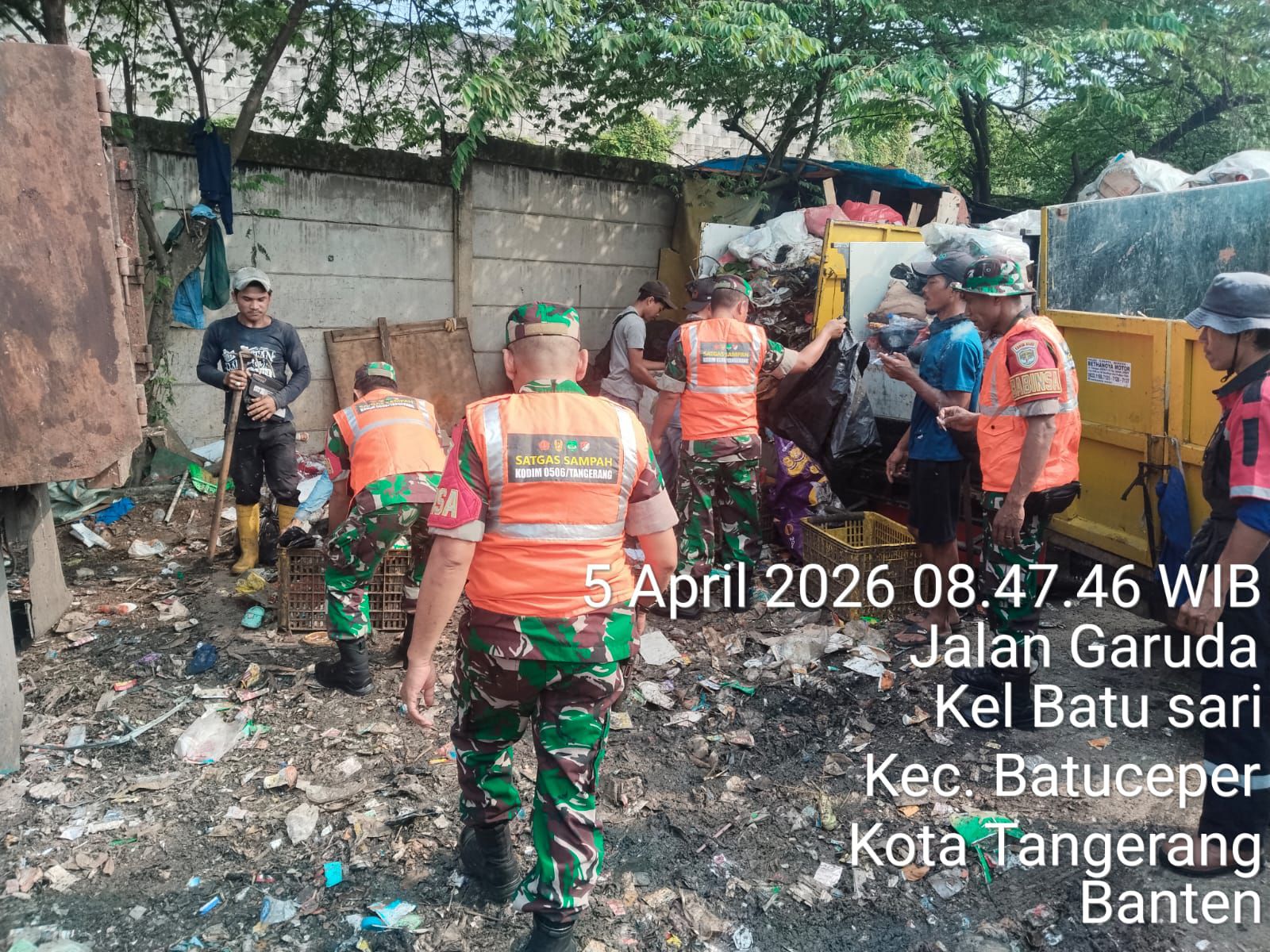 bersama wqrga masyarakat melaksanakan kegiatan gotong royong dengan membersihkan tumpukan sampah di Jalan Garuda Kelurahan Batu Sari Kecamatan Batuceper Kota Tangerang, Minggu (05/04/2026).