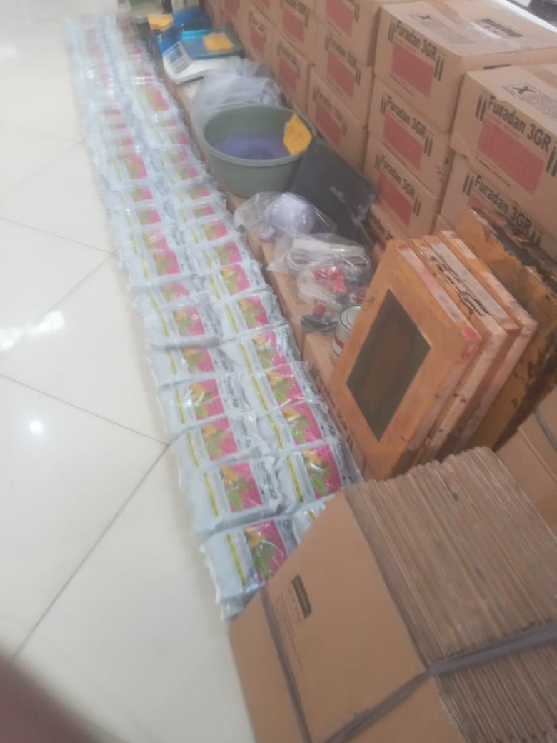 Adapun barang bukti berhasil diamankan antara lain 1.740 pcs pestisida palsu siap edar, ratusan kemasan, mesin segel, peralatan produksi, bahan baku berupa pasir ayak, serta satu unit kendaraan operasional distribusi.