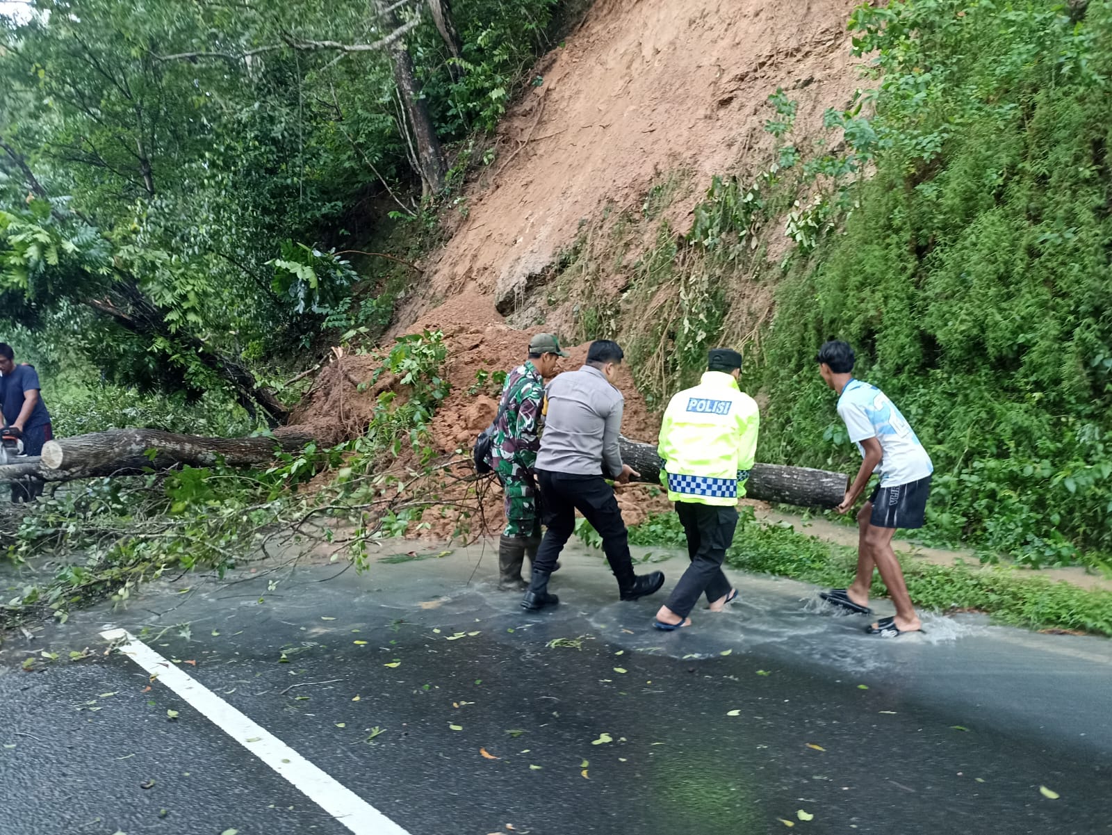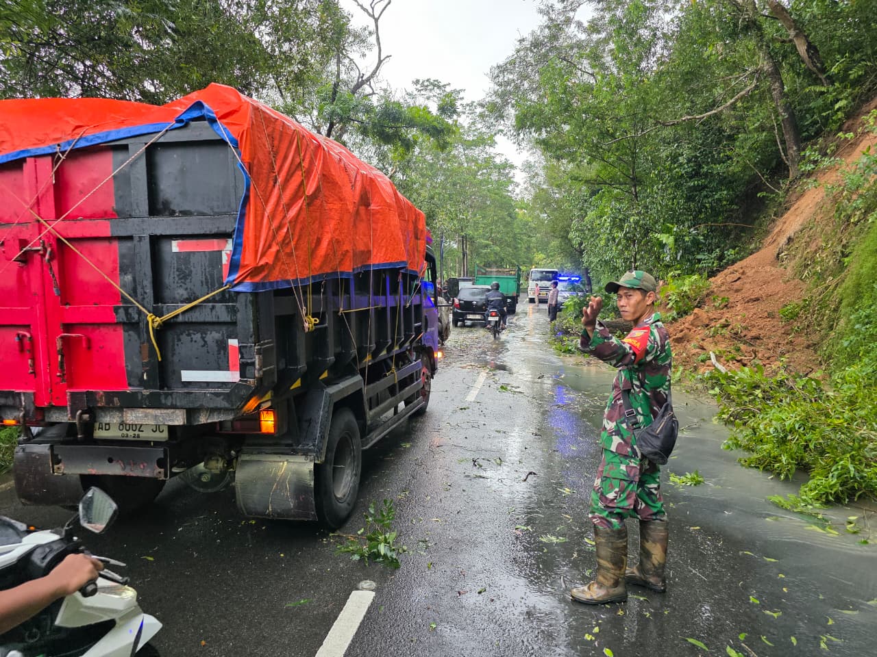 Peristiwa tersebut terjadi sekitar pukul 13.00 WIB hingga 13.30 WIB akibat curah hujan dengan intensitas tinggi yang mengguyur wilayah tersebut. Kondisi cuaca ekstrem memicu terjadinya tebing longsor yang disertai pohon tumbang, sehingga menutup sebagian badan jalan dan menyebabkan arus lalu lintas macet sementara.