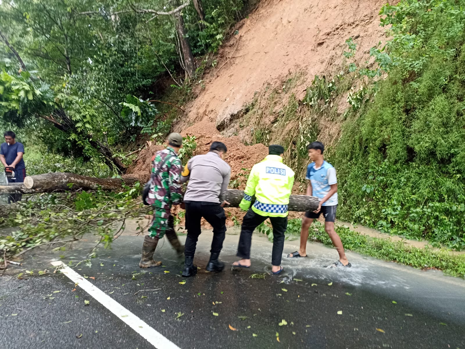 “Kami langsung mendatangi lokasi untuk meninjau kondisi sekaligus membantu proses pembersihan pohon tumbang yang terbawa longsoran. Semua dilakukan bersama-sama agar akses jalan bisa segera dilalui kembali,” ujar Serda Taufik.