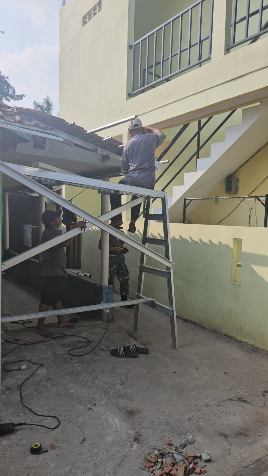 Dalam kegiatan tersebut, Babinsa bersama warga bahu-membahu mengangkat dan menyusun genteng sebagai bagian dari proses penyelesaian atap rumah. Kehadiran aparat TNI di tengah masyarakat menjadi wujud nyata kepedulian terhadap kondisi sosial warga.