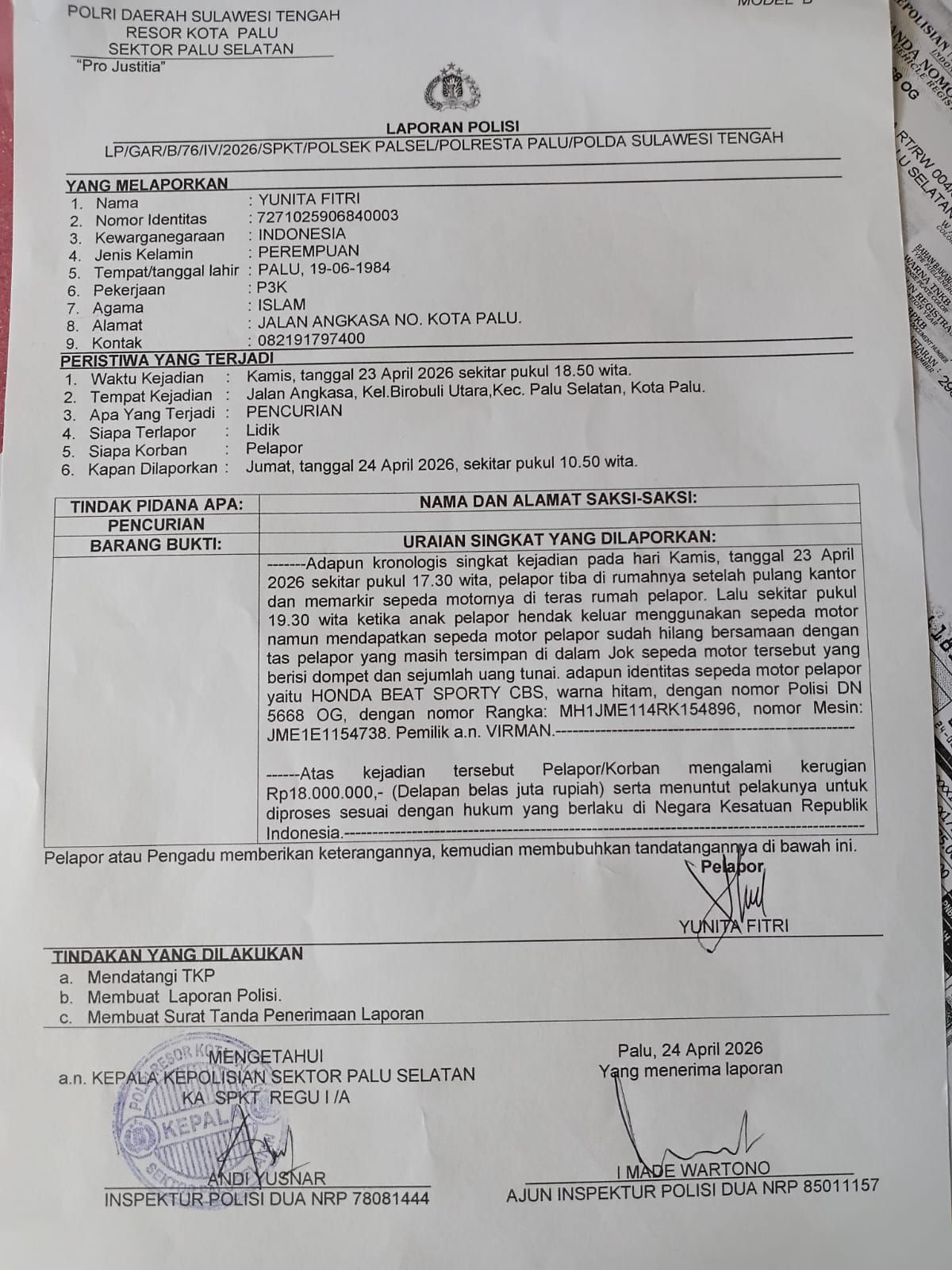 PALU, mediapatriot.co.id – Seorang warga Jalan Angkasa, Kelurahan Birobuli Utara, Kecamatan Palu Selatan, melaporkan tindak pidana pencurian sepeda motor yang terjadi di kediamannya. Laporan resmi telah diterima oleh Polsek Palu Selatan pada Jumat (24/4/2026).