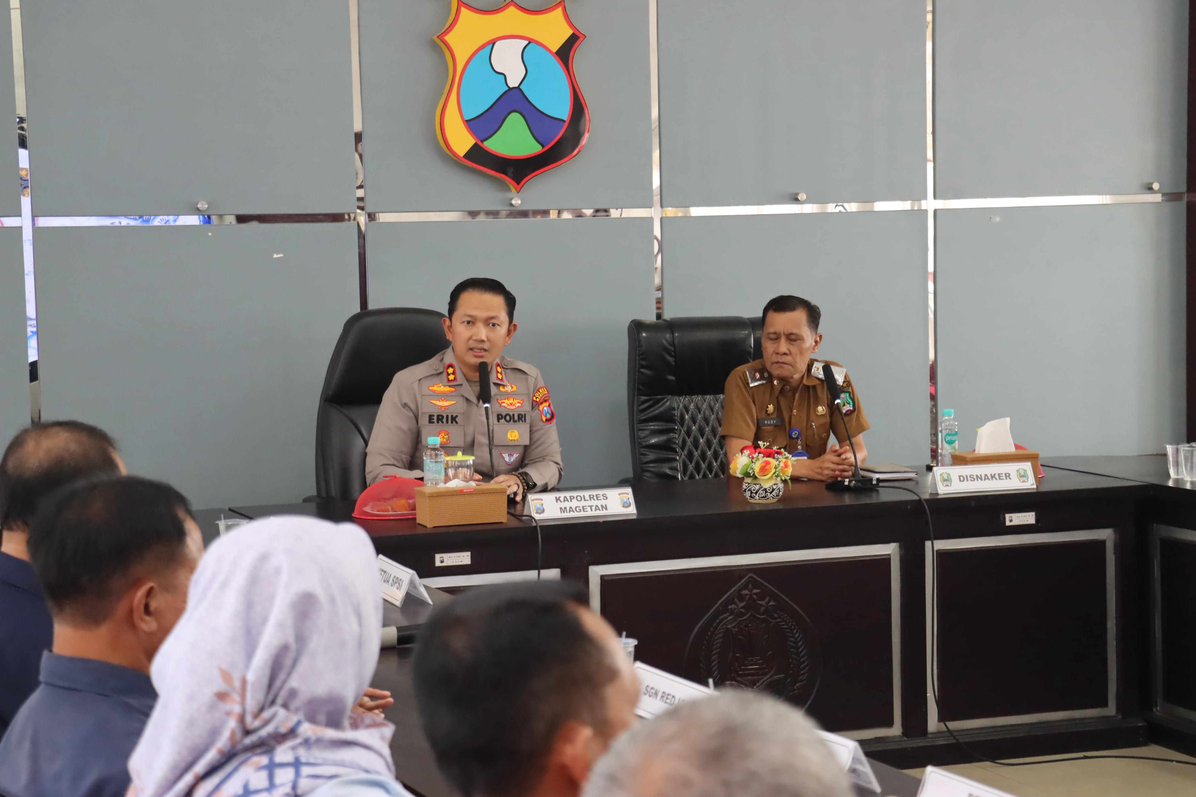 Kegiatan tersebut dipimpin langsung oleh AKBP Dr. Raden Erik Bangun Prakasa selaku Kapolres Magetan, didampingi oleh Bapak Rudy Harsono, Kepala Dinas Tenaga Kerja Kabupaten Magetan. Rapat turut dihadiri oleh Ketua dan perwakilan SPSI Magetan serta perwakilan manajemen perusahaan di wilayah Kabupaten Magetan.