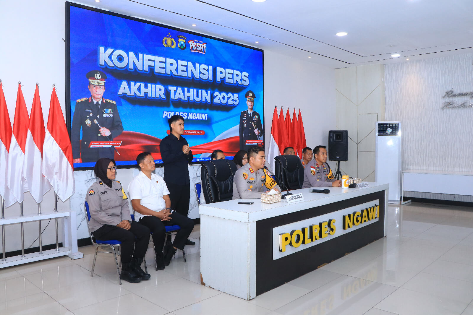 mediapatriot.co.id. Ngawi – Kapolres Ngawi AKBP Charles Pandapotan Tampubolon, S.I.K., S.H., M.H. memimpin langsung kegiatan Rilis Akhir Tahun 2025 yang digelar pada Senin (29/12/2025) di Ruang Guyup Polres Ngawi. Kegiatan ini menjadi momentum evaluasi sekaligus penyampaian capaian kinerja Polres Ngawi selama satu tahun terakhir kepada publik.