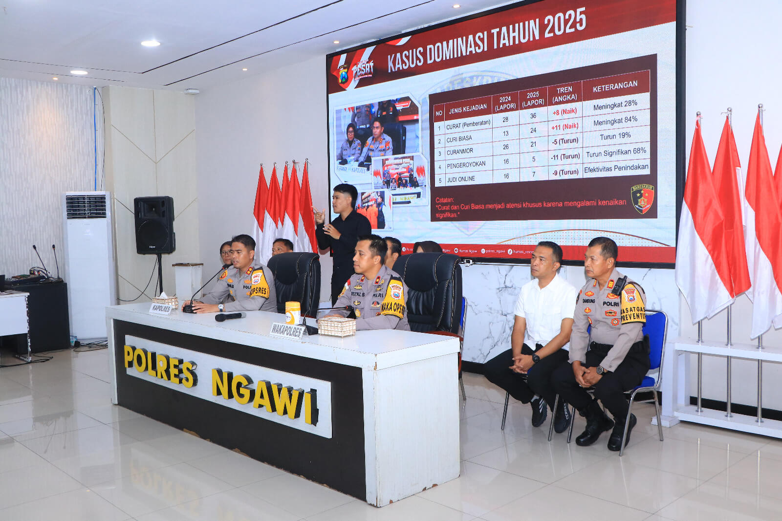 Dalam paparannya, Kapolres Ngawi menyampaikan sejumlah capaian strategis Polres Ngawi dalam menjaga keamanan dan ketertiban masyarakat (kamtibmas), termasuk keberhasilan pengungkapan berbagai kasus tindak pidana. Disampaikan pula perbandingan data kriminalitas bidang reserse kriminal selama dua tahun terakhir sebagai bentuk transparansi kinerja kepada masyarakat.