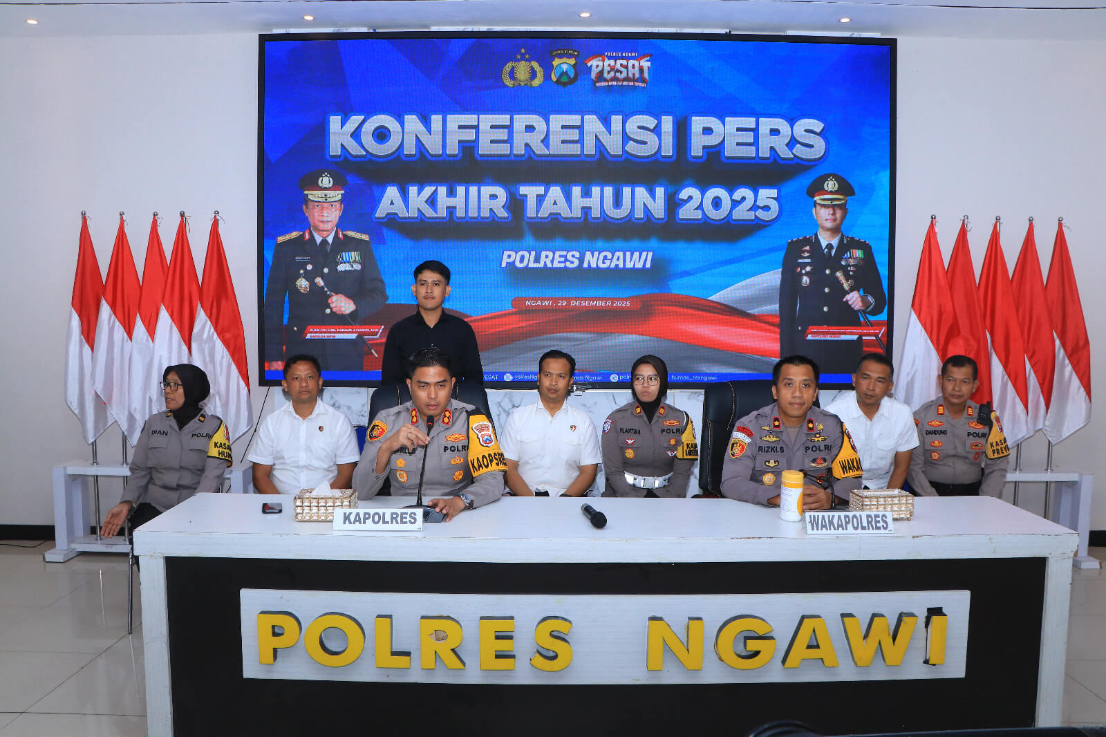 Rilis akhir tahun tersebut turut dihadiri Wakapolres Ngawi Kompol Rizki Santoso, S.I.K., para pejabat utama Polres Ngawi, di antaranya Kasat Reskrim AKP Aris Gunadi, S.I.K., M.H., Kasat Lantas AKP Yuliana Plantika, S.T.K., S.I.K., M.Si., Kasat Resnarkoba AKP Marji Wibowo, S.H., M.H., Kasat Samapta AKP Dandung Setiawan, S.H., M.H., Kasat Intelkam AKP Yoyok Wijanarko, S.H., M.H., serta Ps. Kasi Humas Iptu Dian Ambarwati.