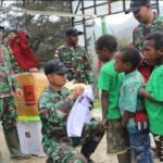 Satgas Yonif Mekanis 203/AK Bekerja Sama Dengan Artha Graha Membagikan Perlengkapan Sekolah Untuk Anak-Anak Pegunungan Tengah